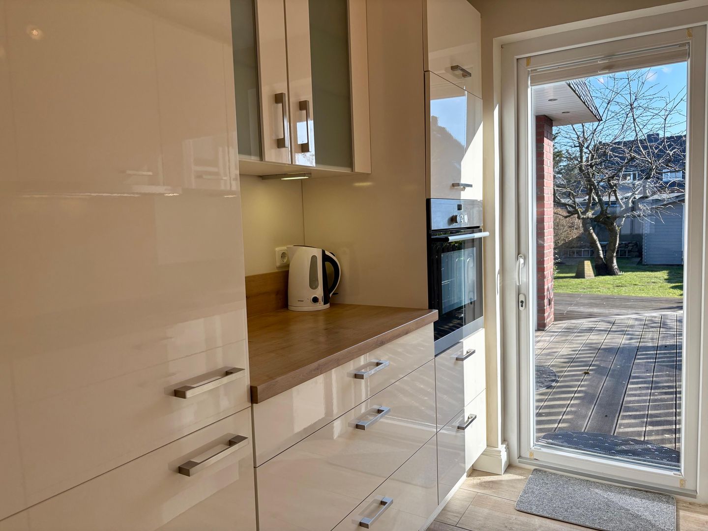 Die im Erdgeschoß gelegene 3-Zimmerwohnung verfügt über einen hell gestalteten Wohnbereich, der in das lichtdurchflutete Esszimmer übergeht. Von hieraus können Sie sowohl zum Osten als auch zum Süden die groß angelegte Terrasse erreichen - ebenso von der Küche. Die exklusiv ausgestattete Küche u.a. mit 4 großen Induktionskochfelder, Hochbackofen mit Dampfgarer, Mikrowelle, Kühlschrank mit Gefrierfach sowie diverse Kleinküchengeräte lässt keine Wünsche offen.