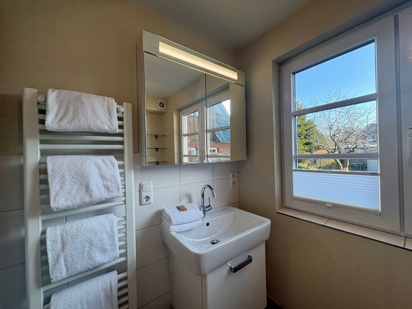 Das moderne Badezimmer hat eine fast bodentiefe Dusche, Waschbecken mit Unterschrank und WC. Angrenzend befindet sich ein zusätzliches Gäste WC. Vom großzügigen Flurbereich gelangen Sie in das Einbettschlafzimmer, in den begehbarem Kleiderschrank und in die begehbare Garderobe.